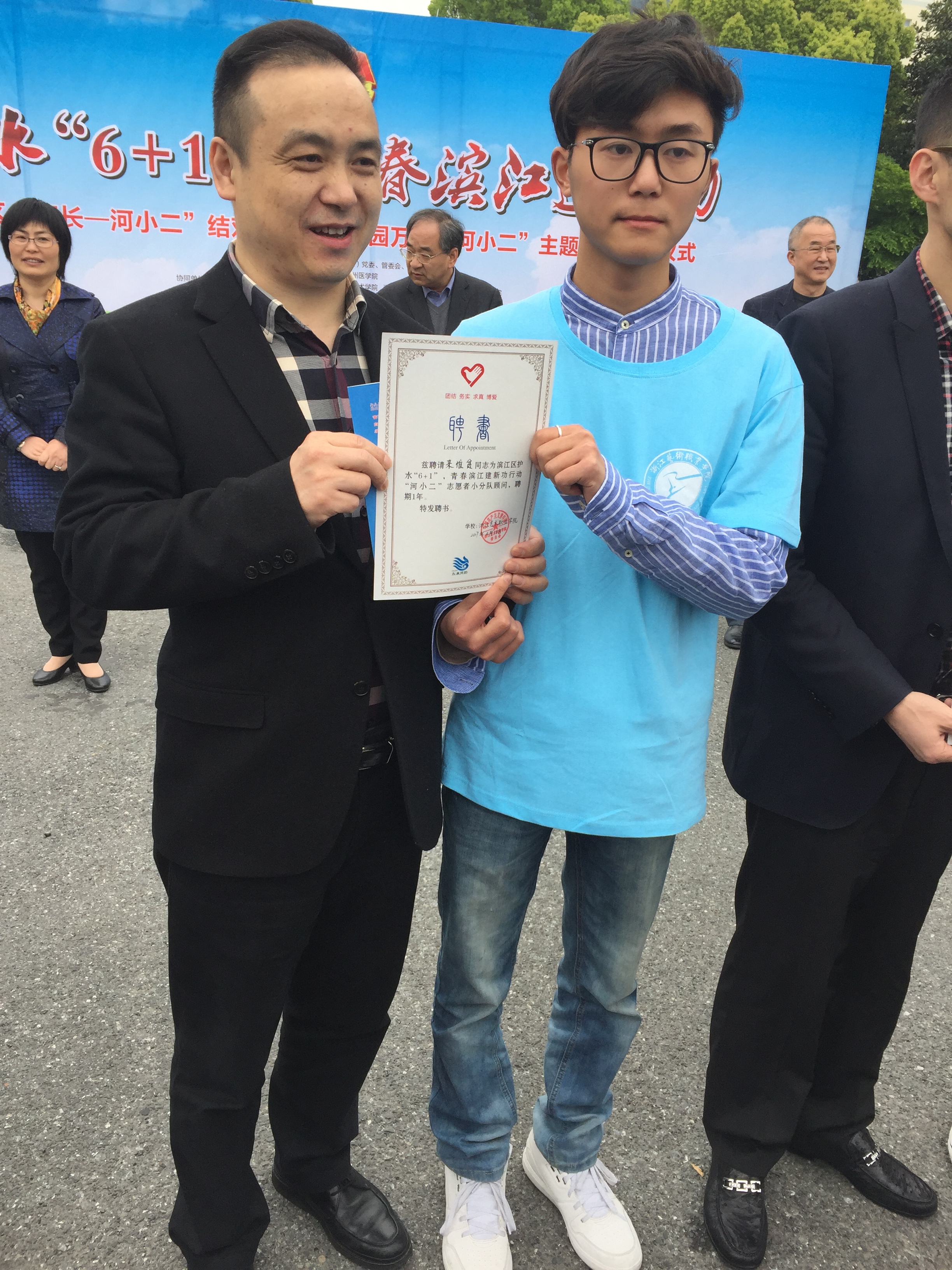 随着全省吹响了新一轮全面治水的号角,高新区(滨江)也打响了“五水共治”的攻坚战。为助推滨江区“剿灭劣V类水”工作,浙艺积极参与筹划由滨江区五水办、团区委等部门共同发起的护水“6+1”志愿实践活动(6所高校与滨江区进行校地合作)。“河小二”是广大青少年参与治水力量的总称,是青年治水的铁军。活动现场,浙艺“河小二”与滨江区高教河河长结对,为河长颁发聘书,现场领导为“河小二”总队和分队授旗。下一阶段,根据省教育厅“百万学生知‘五水’,十万学子巡江河,千支队伍治污水”主题实践活动的要求,浙艺“河小二”青年突击队将开展科普宣传、青山绿水我来绘、智慧巡河、水质跟踪、艺术作品创作展演等一系列活动,全面参与“青”字号美丽浙江创建。
