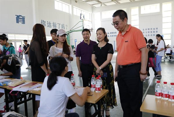 院长黄杭娟、副院长夏开堂、沈军甫来到迎新现场,亲切问候工作在迎新第一线的各系班主任、辅导员,对迎新工作的有序开展给予了肯定,称赞志愿者们服务到位。