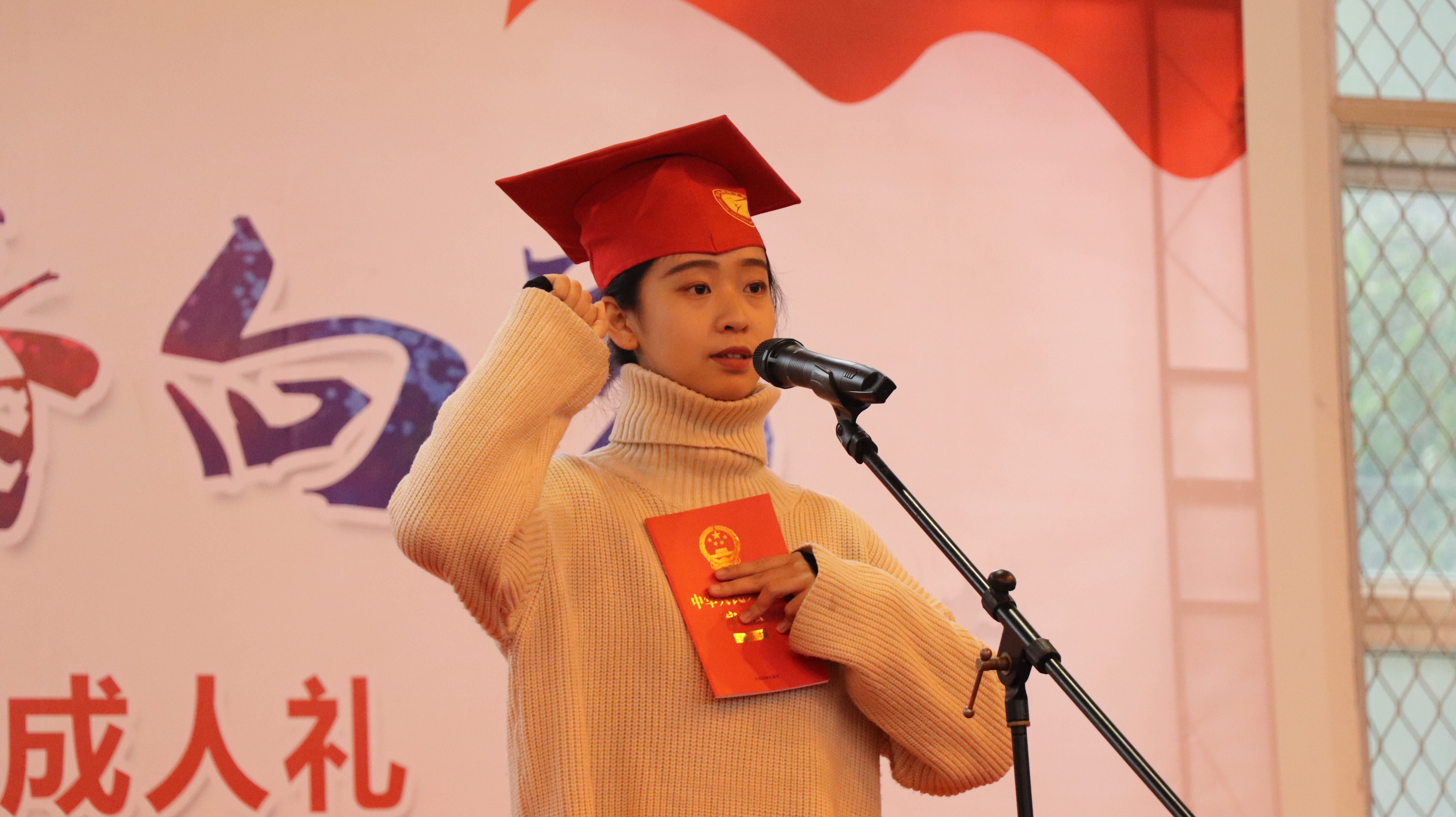 在第二篇章“成长·明责任”中,全体同学头戴成人帽,手持宪法在国旗下进行宣誓。“因为有我,人民将更加幸福,因为有我,家园将更加美好,因为有我,祖国将更加昌盛。”洪亮的声音表明了同学们迈向人生新起点的决心与信心,响彻体育馆。戏剧系的同学们还用诗朗诵的形式献礼青春。