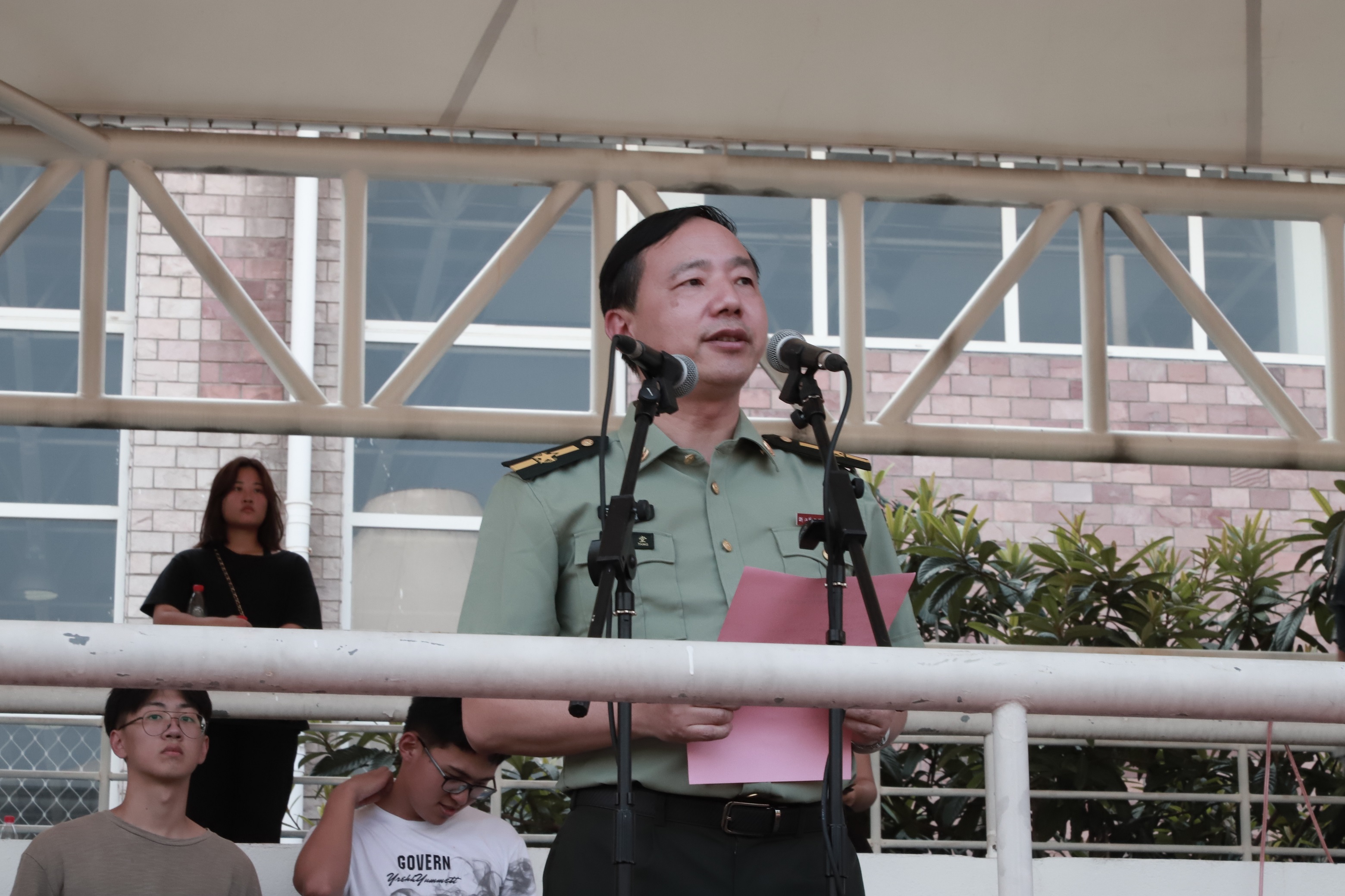 黄杭娟讲话。她向承担今年军训工作的中国人民解放军某部队及各位官兵致以崇高敬意和衷心感谢,对跨入我校学习的1108名新同学表示热烈祝贺。学校开展军事训练,是大学生在校期间接受国防教育、树立爱国主义、集体主义和革命英雄主义的一个基本形式,是我国国防和军队建设培养大批高素质后备人才的有效举措。一直以来,我校非常重视大学生的军训工作,邀请经验丰富的承训部队,精心安排训练计划,细致做好各项服务,每届参训学生的政治觉悟、理想信念、思想品德、作风纪律、军事技能、国防观念、身体素质等各方面都得到了锻炼和提高。黄杭娟对新生们提出三点希望:提高认识,居安思危,牢固树立保家卫国的国防意识;严明纪律、听从指挥,牢固树立令行禁止的纪律意识;端正态度,自立自强,牢固树立互帮互助的团队意识。