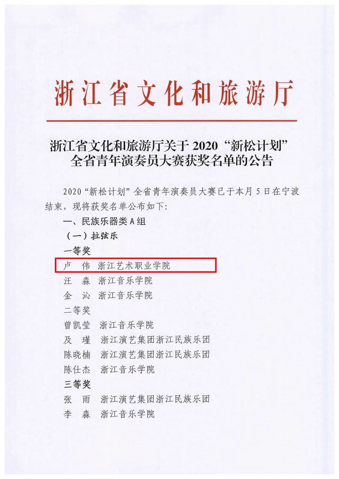 喜报!由浙江省文化和旅游厅主办的2020“新松计划”浙江省青年演奏员大赛获奖名单新鲜出炉,我校喜获6项大奖:青年教师卢伟、常轶伟、夏金瓯分别喜获民族乐器类A组拉弦乐、吹奏乐和弹拨乐一等奖,学生宋涛、周润分别喜获民族乐器类A组吹奏乐和弹拨乐三等奖,青年教师孙竹喜获西洋乐器类A组钢琴(竖琴)三等奖。创我校“新松计划”音乐类比赛最好成绩。