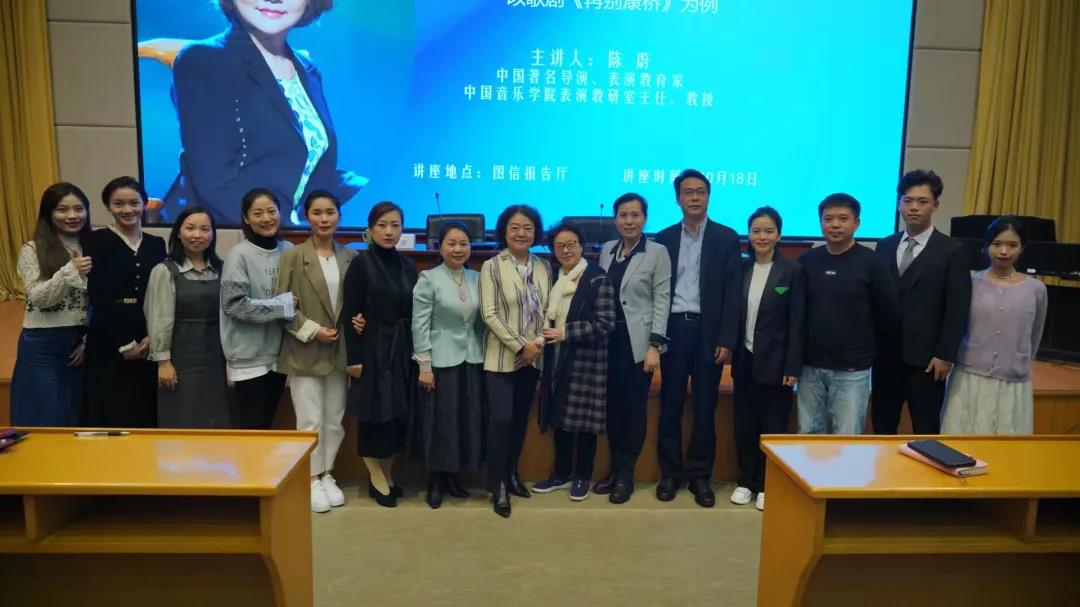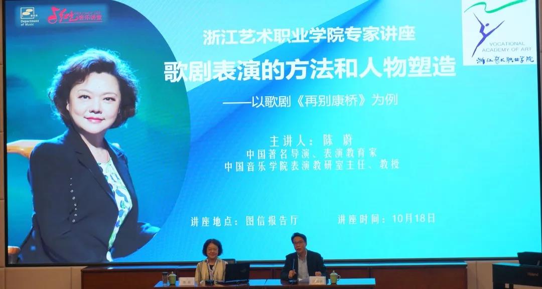 10月18日,著名戏剧导演、表演教育家、中国音乐学院声乐歌剧系表演教研室主任陈蔚教授应邀做客浙艺音乐系“红色音乐讲堂”,以《歌剧表演的方法和人物塑造——以歌剧<再别康桥>为例》为题作精彩讲座。音乐系主任、党总支书记吴樟华主持,音乐系领导班子成员、声乐歌舞音乐剧专业师生参加。