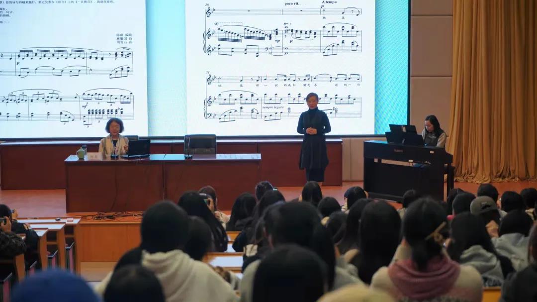 讲座上,陈蔚结合自身丰富经验,针对声乐表演专业的特点,以歌剧《再别康桥》为蓝本,从背景资料、采风、人物分析、人物关系的建立和变化、通读剧本、音乐作业和音乐台词坐排以及戏剧排练、试装、合乐、合成演出等多要素出发,讲解和欣赏相结合,详细阐述了歌剧表演的方法和演员所应具备的素质。在互动交流环节,陈蔚对吴婷婷老师演唱的剧中咏叹调《一首桃花》,两位学生演唱的《再别康桥》唱段进行了现场指导。陈蔚寄语师生们,对于歌剧表演艺术要遵循“三规”“三真”“三感”“三度”“三统一”“三呈”“三专”“三严、三练、三责”的原则,要将文化繁荣作为艺术从业者的不懈追求。