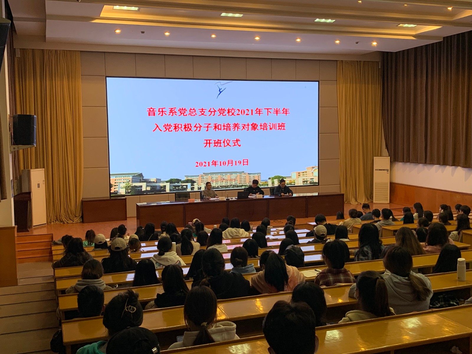 10月19日晚,音乐系党总支分党校2021年下半年入党积极分子和培养对象培训班开班仪式在学校图信报告厅举行,音乐系党总支常务专职副书记谢志勇,党总支专职副书记刘梦伟,学生党支部全体党员、重点培养对象、入党积极分子、党校学员等一百六十余人参加。