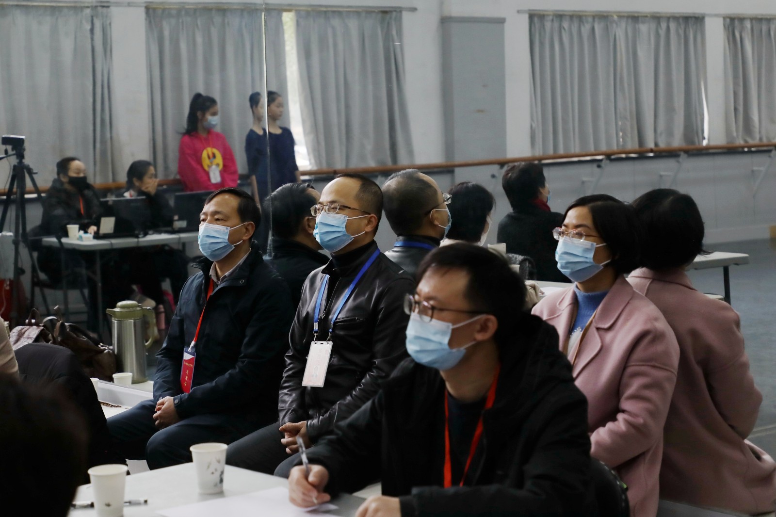 考生们在排队等候时的状态各有不同,或在候考室进行热身,或低头默记曲谱,或在一旁做深呼吸调整情绪。而在校外等候的家长也不轻松,有的家长频频望向校内,有的通过视频电话和其余在家中等候的家人们交流孩子的状况。