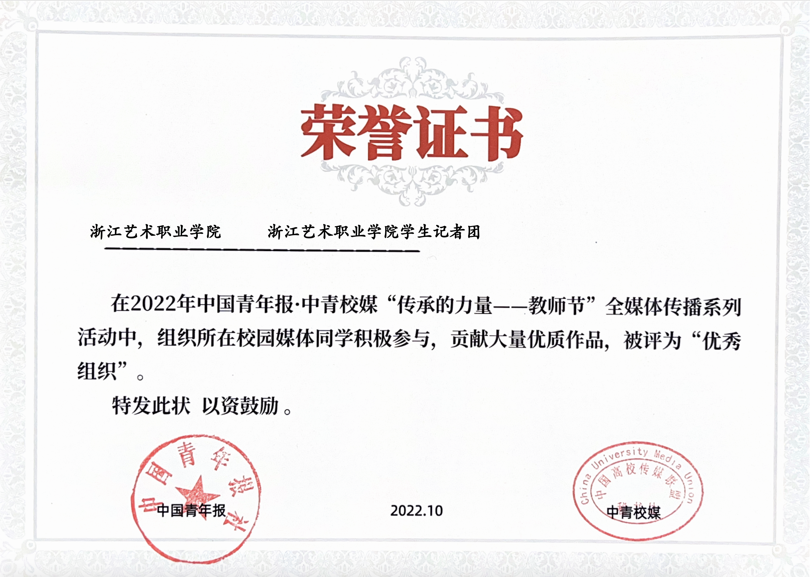 在2022年上半年公布的2021年度浙江省优秀教育新媒体评选活动结果中,浙艺荣获浙江省高校(高职高专)新媒体综合力十强。在2021年浙江教育政务新媒体传播力月排行榜和2022年季度排行榜中,浙艺多次进入全省高职院校前十强。2022年中国青年报·中青校媒“传承的力量——教师节”全媒体传播系列活动中被评为“优秀组织”。