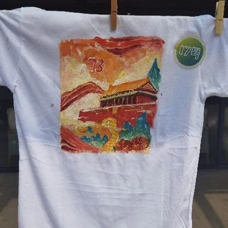 同学们用手中的彩笔在白色T恤上描绘出自己心中美丽的祖国,表达自己对伟大祖国的热爱之情和美好祝福。