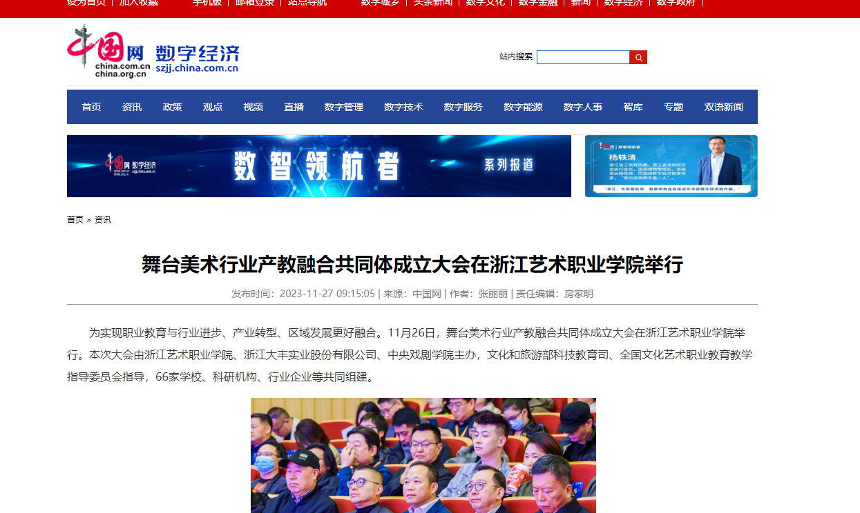 浙江大丰实业股份有限公司董事长丰华在致辞中表示,共同体的建立,可以通过定期举办赛事、学术研讨会、讲座、展览等活动,搭建起学术交流平台,促进会员之间的交流与合作,推动舞台美术教育的理论研究和实践创新,推动舞台美术教育改革与发展。