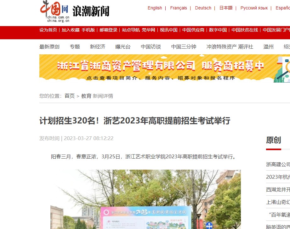 中国网浪潮新闻:计划招生320名!浙艺2023年高职提前招生考试举行